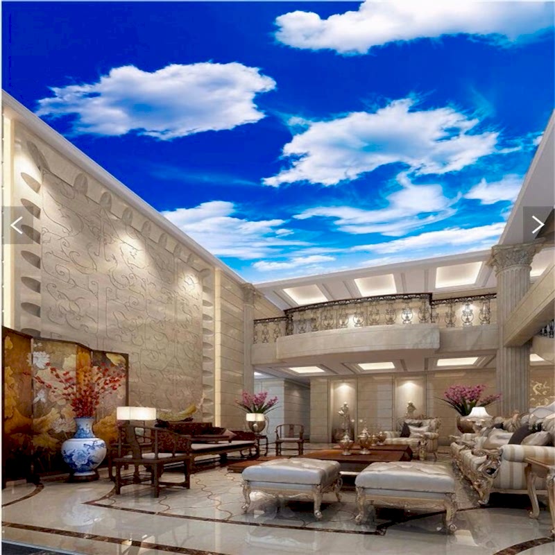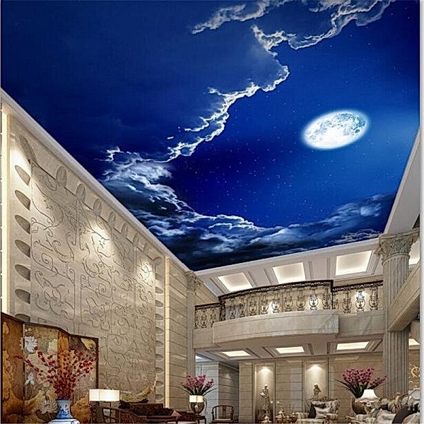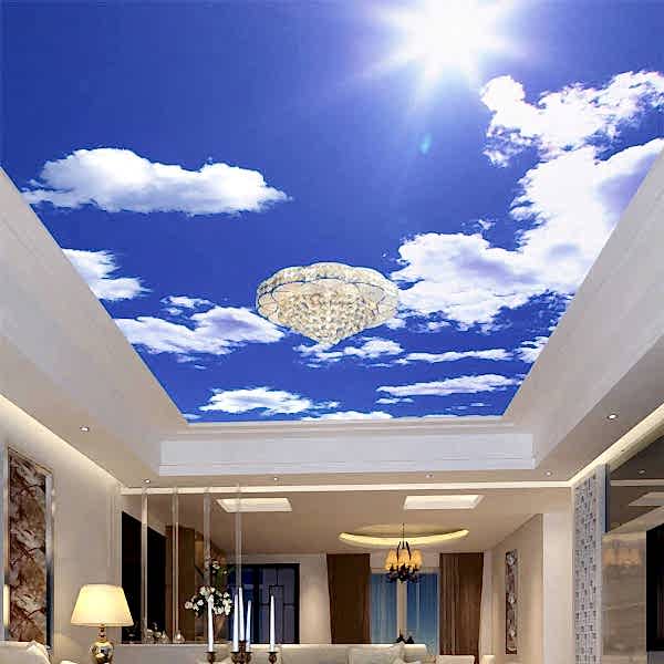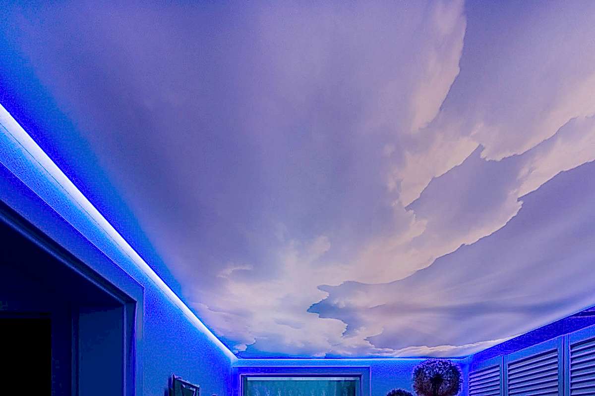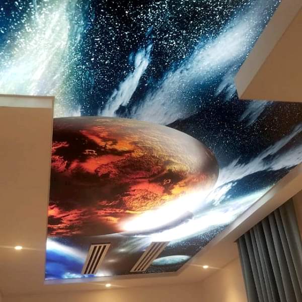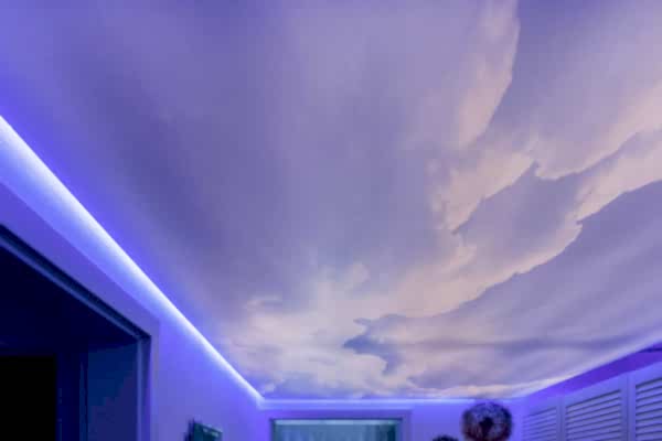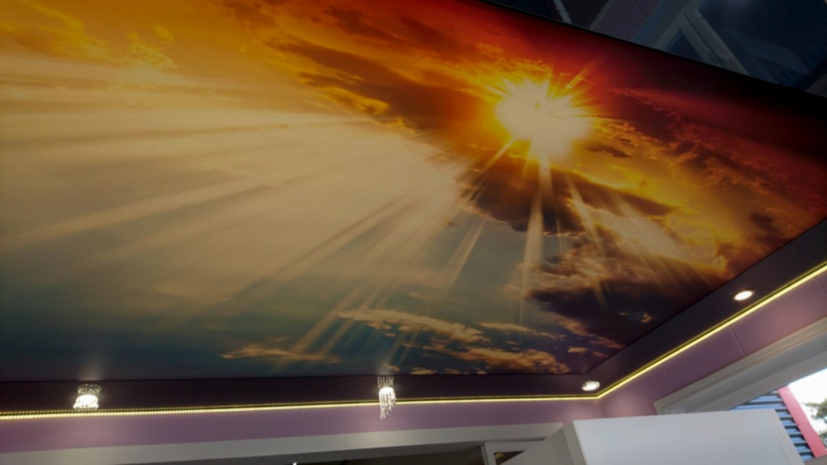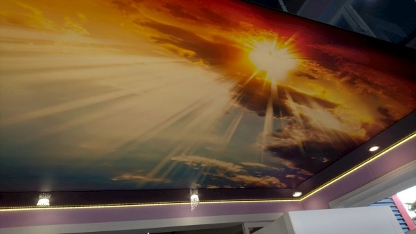 Менее затратной по времени и деньгам технологией станет Pin Up потолка с фотопечатью без встроенного освещения или напечатанного на полупрозрачной пленке. На черновую поверхность устанавливают светодиодные ленты, от которых на некотором расстоянии монтируется светопропускающая ПВХ с рисунком ночного неба. Такой потолок хорош в сочетании с матовым белым как дополнительный акцент в двухуровневой конструкции.